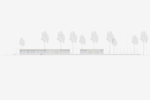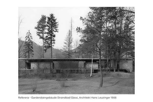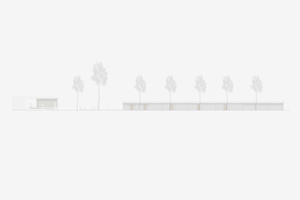 Das Hauptfeld tritt mit seinem blickdichten Rand als präzises Volumen in Erscheinung. Es führt die städtebauliche Struktur entlang der Freiburgstrasse weiter. Das Garderobengebäude als neuen Baukörper, bildet mit seiner Längsausrichtung entlang des gesamten Hauptfeldes, den Abschluss der Struktur. Das zweite Feld dagegen liegt abgedreht in der Richtung der bestehenden Kunstrasenfelder und lenkt mit dem Volumen des Werkhofgebäudes die Richtung der bestehenden Kunstrasenfelder ein. In der Verschränkung der beiden Richtungen organisiert neu eine dreiteilige Platzfolge Z-förmig die Mitte der Anlage. Umschlungen vom Grüngürtel des Könitzbergwaldes, liegt die Sportanlage, eingebettet im städtischen Kontext. Der längsgerichtete, eingeschossige Baukörper, liegt auf einer erhöhten Platte, auf welcher die gesamte Interaktion von Sportler und Zuschauer stattfindet. Zwei unterschiedlich grosse Volumen, sind der öffentlichen Nutzungen der Sportanlagen bestimmt. Darübergestülpt, werden in einem engen Raster, Stützen und Trägerelemente, welche dem Baukörper seinen rationalen Ausdruck verleihen. Auf der Ostseite gegen den Platz gerichtet, stehen die Stützen auf dem Terrain und bilden einen arkadenähnlichen Raum. Dieser dient als Filter zwischen Aussenplatz und Garderobengebäude und bietet den Sportler Schutz vor Witterung. In der Repetition dieser Struktur, sind die gesamten Garderoben und Duschen sowohl im Erdgeschoss als auch im Untergeschoss aufgereiht. Nach oben abgeschlossen wird der Bau mit einer schmalen Scheibe, welche längs auf den Trägerelementen liegt. Diese dient dem Witterungsschutz und gibt dem Baukörper, nach oben eine Leichtigkeit. Die südseitig, nicht überdeckte Fläche der Plattform, dient dem Zuschauer während den Meisterschaftsspielen. Die freistehenden Stützen- und Trägerelemente, wirken raum- und volumenbildend, lassen jedoch Transparenz zu den dahinterliegenden Sportanlagen zu. So ergeben sich spannende Durchblicke zwischen dem Hauptfeld und den Trainingsanlagen, was zu einer gesamten Übersicht der Sportstätte führt.