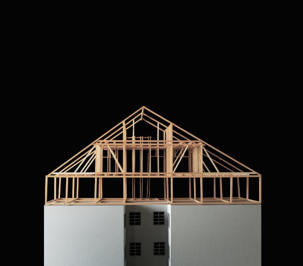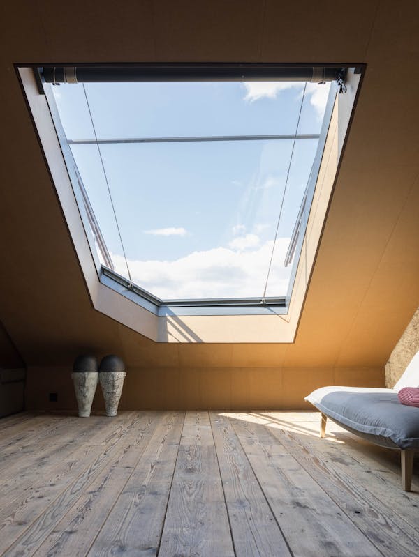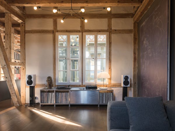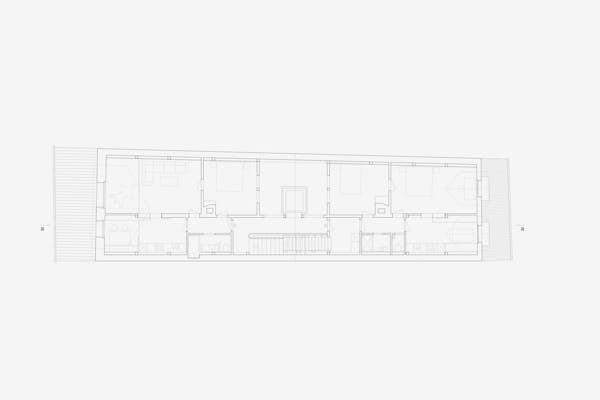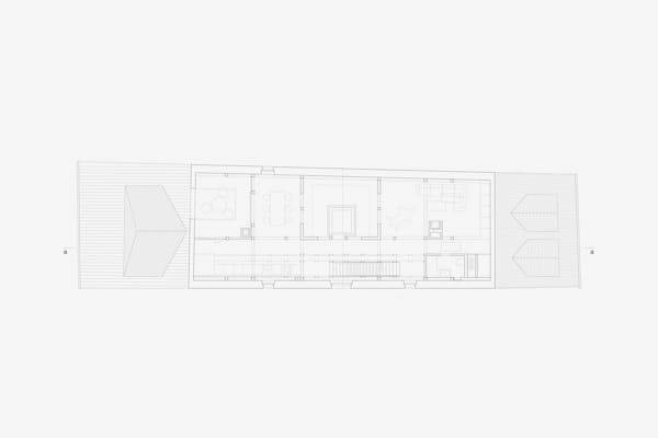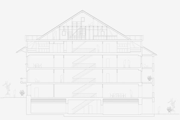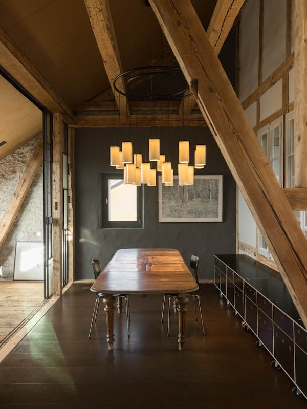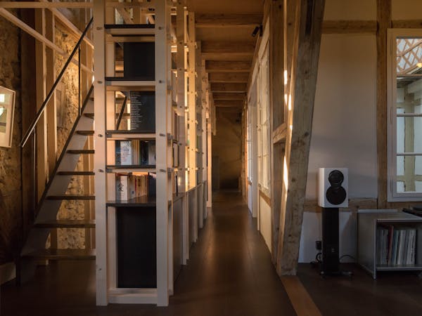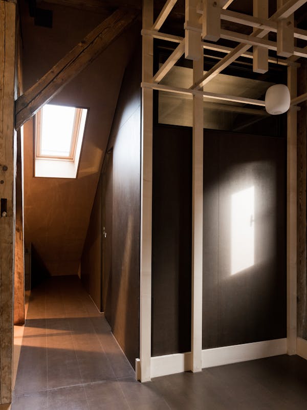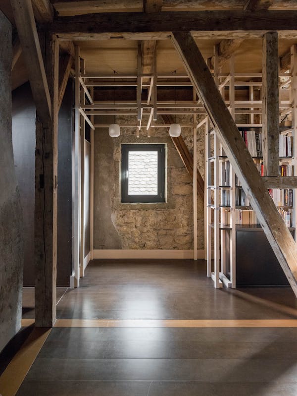 wird auch der Dachstuhl neu errichtet, ein zweigeschossiges Zimmermannsgefüge, wo Balken, Pfosten und Streben ein Raumwerk bilden, was beeindruckt in Grösse und Präzision. Dieses über 170 Jahre alte Raumwerk gibt den Takt vor. Ergänzungen folgen, in Form einer sekundären Raumstruktur aus Eschenholzstäben, welche die Tiefe des Baukörpers zoniert. Treppe, Nasszelle und Küchen reihen sich auf umfasst und artikuliert von horizontalen und vertikalen Linien. Die energetische Ertüchtigungen an Dach und Fenstern erlauben, dass freilegen der Brandmauer, so dass der gelblich schimmernde Kalktuff wieder atmen kann. Nachverdichten und zusammenlegen war der Wunsch. So wurde die ehemalige Bedienstetenwohnung im 3. OG mit dem zweigeschossigen Dachraum verschmolzen, was den heutigen Bedürfnissen der Bewohner entspricht. Die wieder Entkopplung ist mitgedacht und kann jederzeit erfolgen. Das Projekt erschliesst sich durch seine beeindruckende Bauweise, verwendete Materialien, betonte Formen und hinterlassenen Spuren. Es wird gefügt und entflochten, bis neuer Wohnraum entsteht. Licht und Schatten auf samtigen, rauen und porösen Oberflächen, tragen zur Atmosphäre bei.