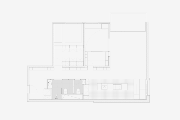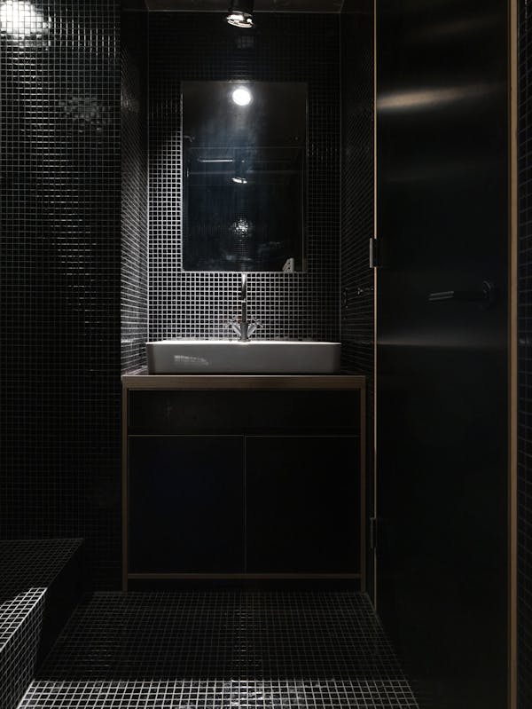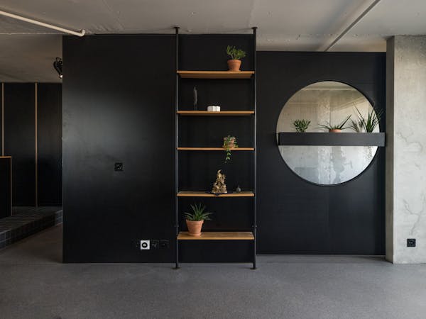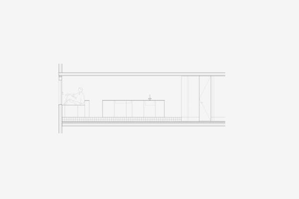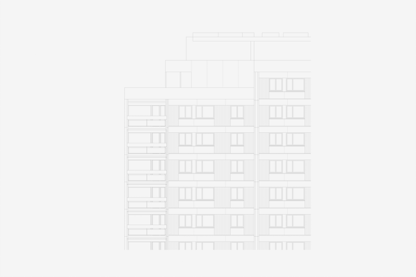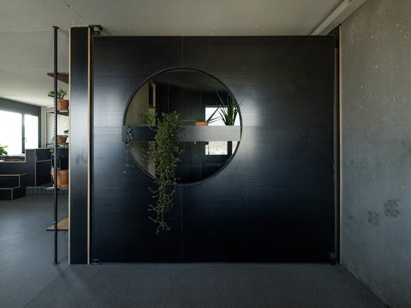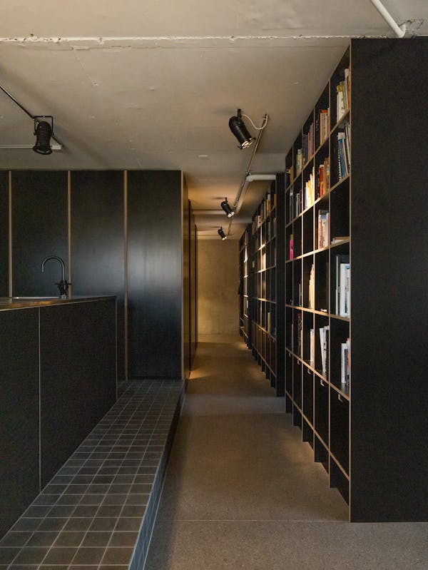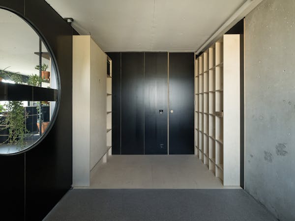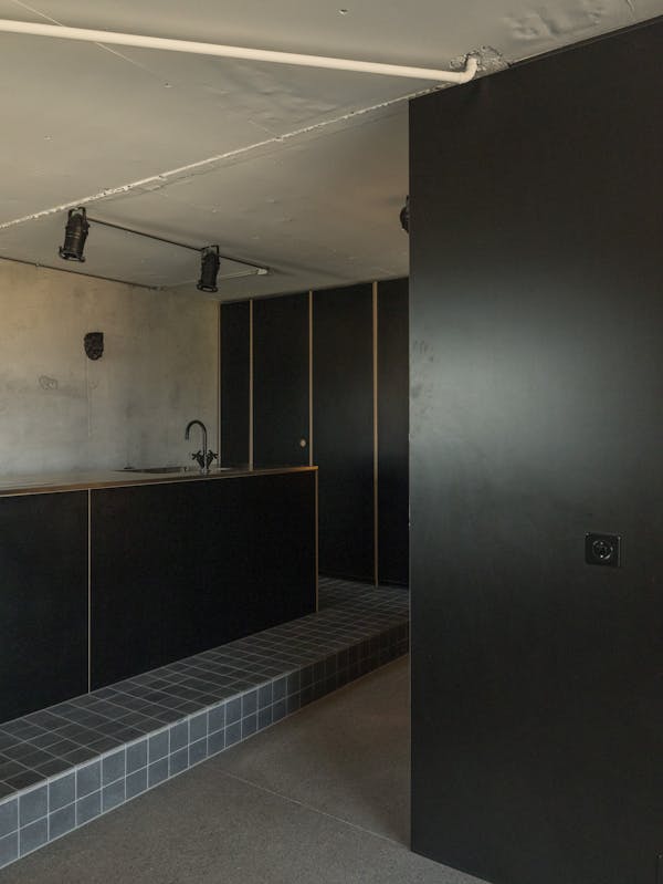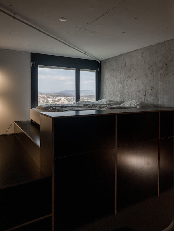 Wie viele in die Jahre gekommenen Wohneinheiten in der Siedlung, musste auch die Wohnung im Hochhaus Nr.5 im obersten von 24 Vollgeschossen total saniert werden. Beeindruckt von den rationell vorfabrizierten und sichtbaren Betonscheiben des Tragwerks, wurden die tragenden Innen und Aussen Wände von ihren Verputzen, Gipsglattstrichen und Tapeten befreit. Es galt, die grossen Betonscheiben auch im Innern sichtbar zu machen, was zu einem atmosphärischen Ganzen von Tragen und Lasten führt. Der geschliffene und polierte Terrazzo Bodenbelag ist die einzig „noble“ Oberfläche im Raum. Küche, Bibliothek, Schlafzimmer und die Gästeschlafkoje sind in schwarzen beschichteten Phenol-Multiplexplatten gefertigt, welche einen weichen und geschmeidigen Kontrast zu den rohen Betonwänden bilden. Die Nasszellen sind in schwarzen Glasmosaikfliessen belegt was dem Gesamtkonzept von Haupt- und Nebenräumen entspricht. Die Idee der Sichtbarkeit von Material und Haptik wurde hier konsequent umgesetzt.