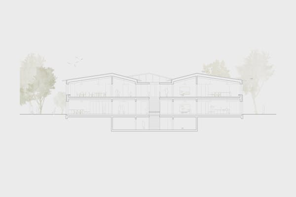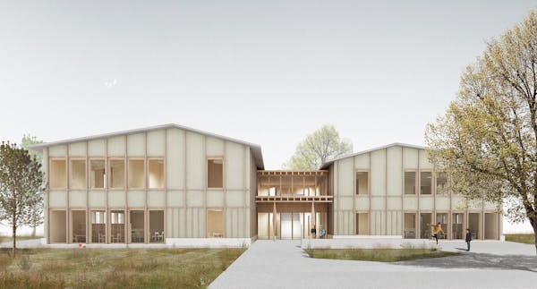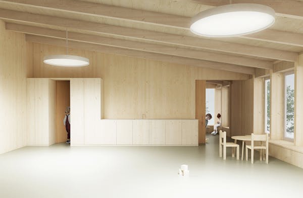 Der neue Kindergarten soll als ein kultivierter konstruktiver Holzbau stehen, welcher auch in seiner räumlichen Qualität zu überzeugen vermag. Die leicht geneigten Satteldächer schaffen formale Bezüge zur bestehenden Schulanlage und passen sich so in die ländlich geprägte Siedlungsstruktur ein.