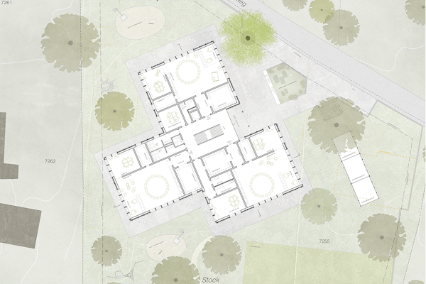 Der neue Kindergarten am nördlichen Parzellenende der Gesamtschulanlage, versteht sich als Teil der Gesamtanlage Stock. Der neue Baukörper richtet sich in seinen Geometrien einerseits der Schulanlage im Süden zu, andererseits richtet sich der Neubau gegen den Stockweg hin, wo ein neuer Ankunftsplatz aufgezogen wird. So entsteht ein zusammenhängender Baukörper, welcher mit seinen charakteristischen 3 Hauptvolumen, zwischen der bestehenden Schulanlage und der angrenzenden Siedungstruktur zu vermitteln vermag.