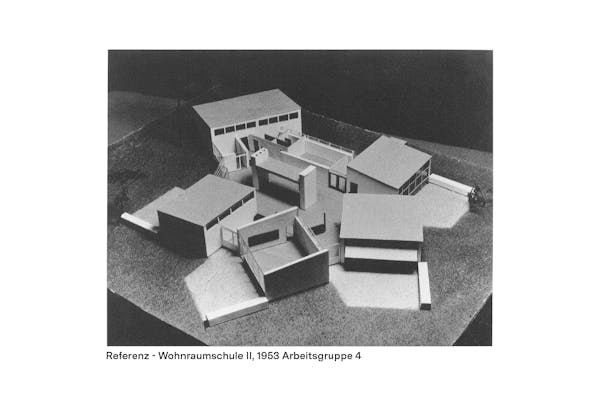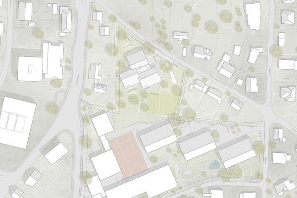Der zwischen die 3 Hauptvolumen eingeschobene, in der Höhenstaffelung tiefer gelegene Baukörper, öffnet sich zum bestehenden Tulpenbaum, wo ein befestigter Aufenthaltsplatz die klare Adressbildung und Ankunftsort artikuliert. Der rationell erstellte Ingenieurholzbau lehnt sich in seiner konzeptionellen Konstruktionsweise, der ebenfalls rationell erstellten Modulbauweise der bestehenden Schulanlage aus den 60er - 70er Jahren an.