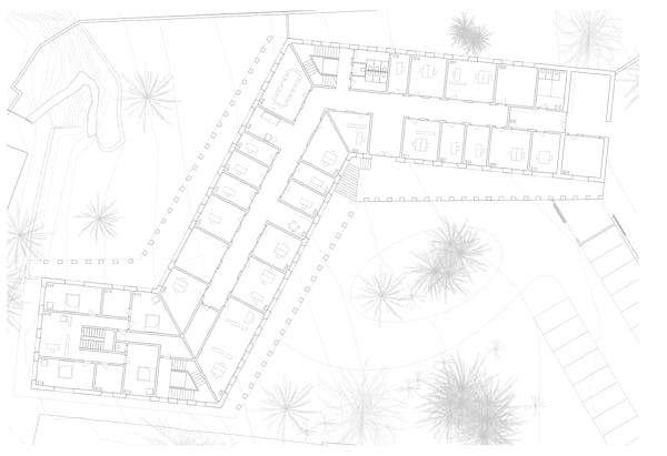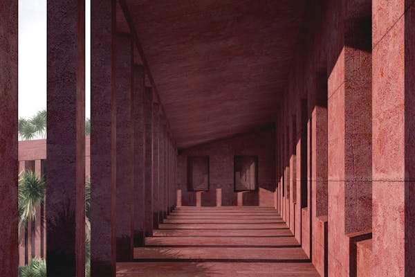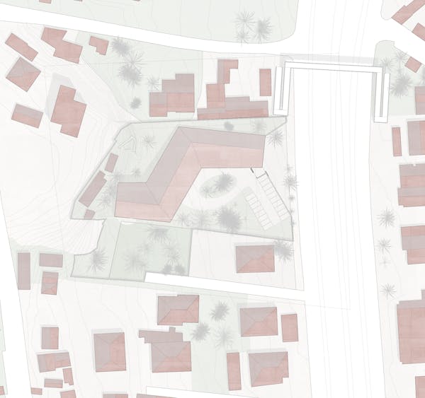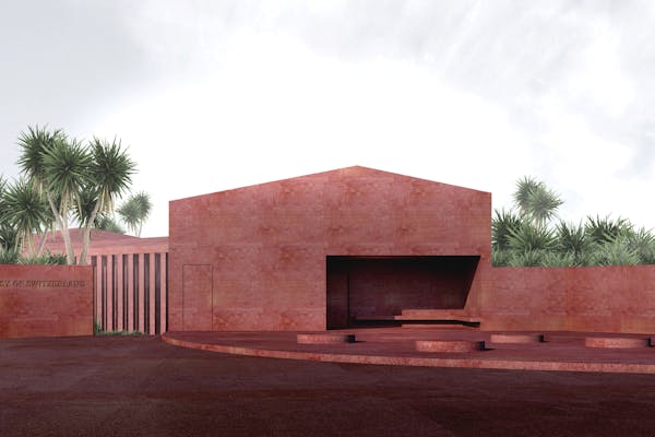 Das Projekt «Mia Mia» vereint alle Nutzungen der schweizerischen Botschaft unter einem Dach. Die Kanzlei und die Residenz werden ganz im Interesse der Bauherrschaft, in einem harmonischen Verhältnis städtebaulich vereint. Der rote Baukörper passt sich optisch den umliegenden Gebäuden an, während seine plastische Form bewusst mit der geschachtelten bebauten Umgebung kokettiert. Das Projekt Mia Mia liegt selbstbewusst in der Parzelle ohne aufdringlich oder konkurrenzierend zu wirken. Seine winklige Form schafft vielseitige Ausrichtungen und ermöglicht differenzierte Bezüge zum Aussenraum. Die prägnante Dachform ist eine Anlehnung an schweizerische Typologien, gepaart mit der traditionellen örtlichen Baukultur. Die konischen Öffnungen in der Fassade betonen die Plastizität und lockern die Schwere des Materials auf. Das Stützenraster nimmt Bezug auf die innere Ordnung, welche sich stringent und konsequent durch das langgezogene Gebäude zieht.
